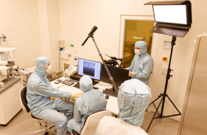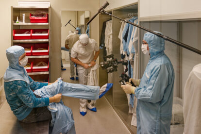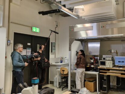 Für das Filmteam der Firma Alter-Cine war dieser Mittwoch im November sicherlich ein ebenso ungewöhnlicher Arbeitstag wie für das Team des ForLab Bochum. Das fing mit dem ersten Punkt auf der Tagesordnung an: dem Anziehen der Reinraum-Kleidung. Im besonderen Outfit ging es quer durch den Reinraum zur Materialschleuse, wo das umfangreiche Film-Equipment darauf wartete, für den Einsatz im Reinraum abgereinigt zu werden. Danach konnten die Aufnahmen endlich starten.